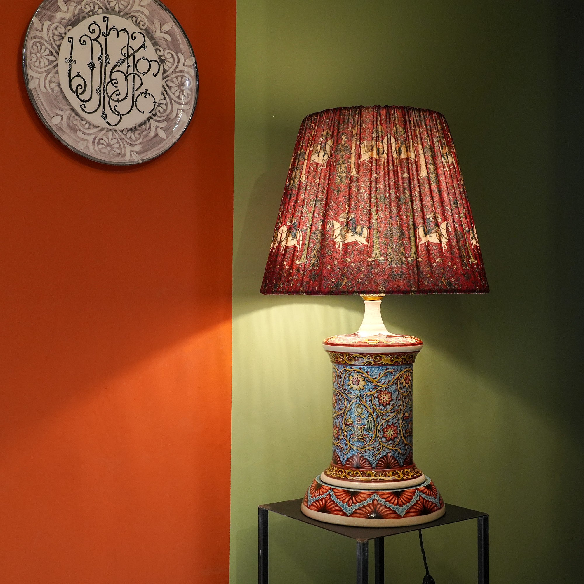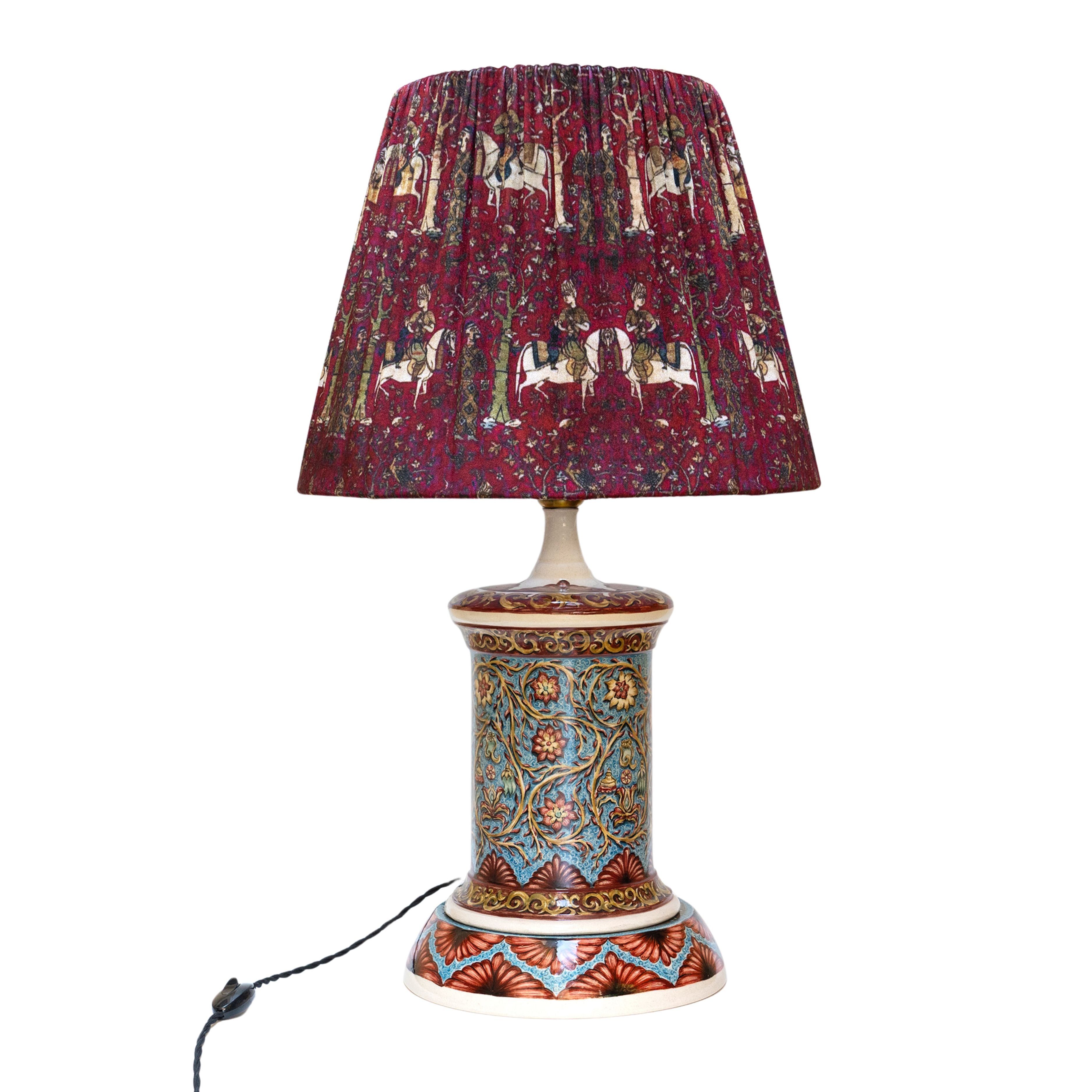 Add a touch of timeless elegance to your space with this handcrafted ceramic table lamp, adorned with a richly textured red shade. The intricate base features a unique, hand-painted ceramic design, showcasing traditional patterns and colors. The fabric shade brings a regal charm with its horse and floral motifs, perfectly complementing the ornate ceramic base. Ideal for those who love vintage-inspired décor with a modern twist.