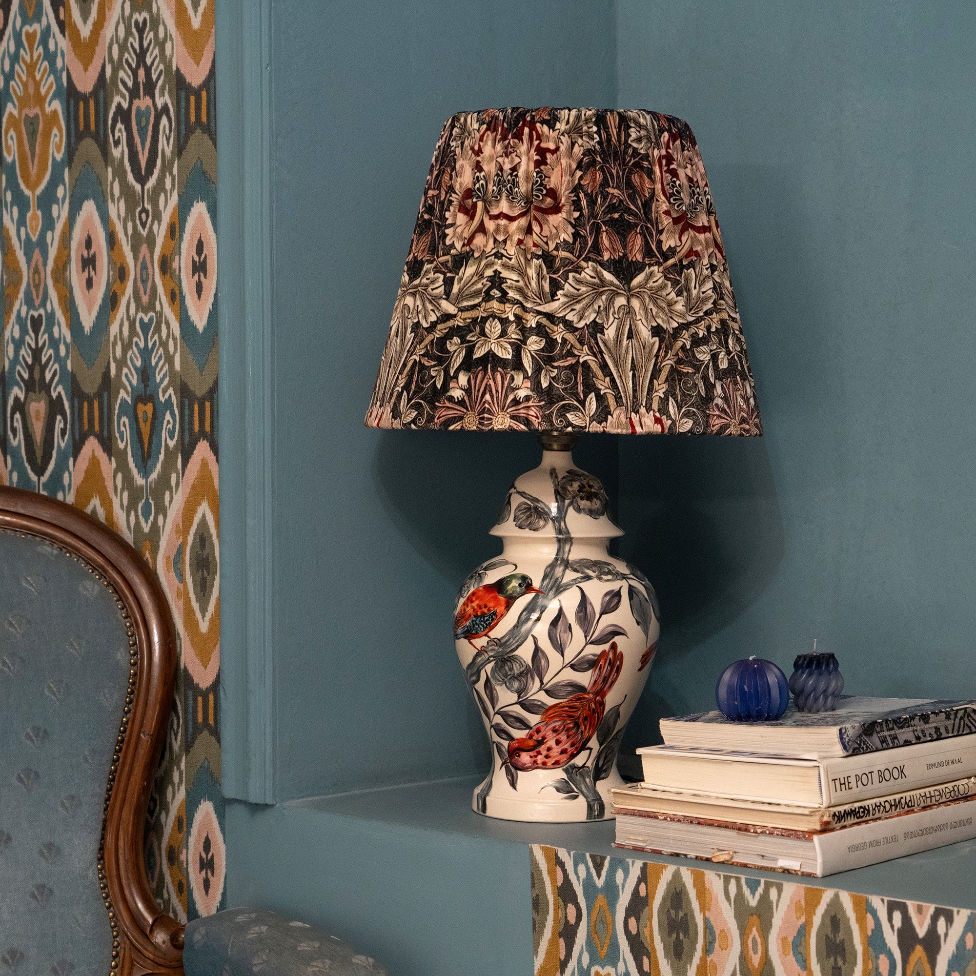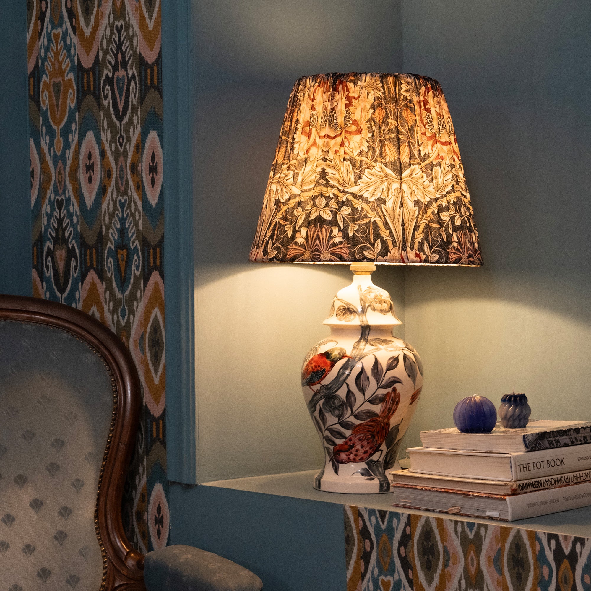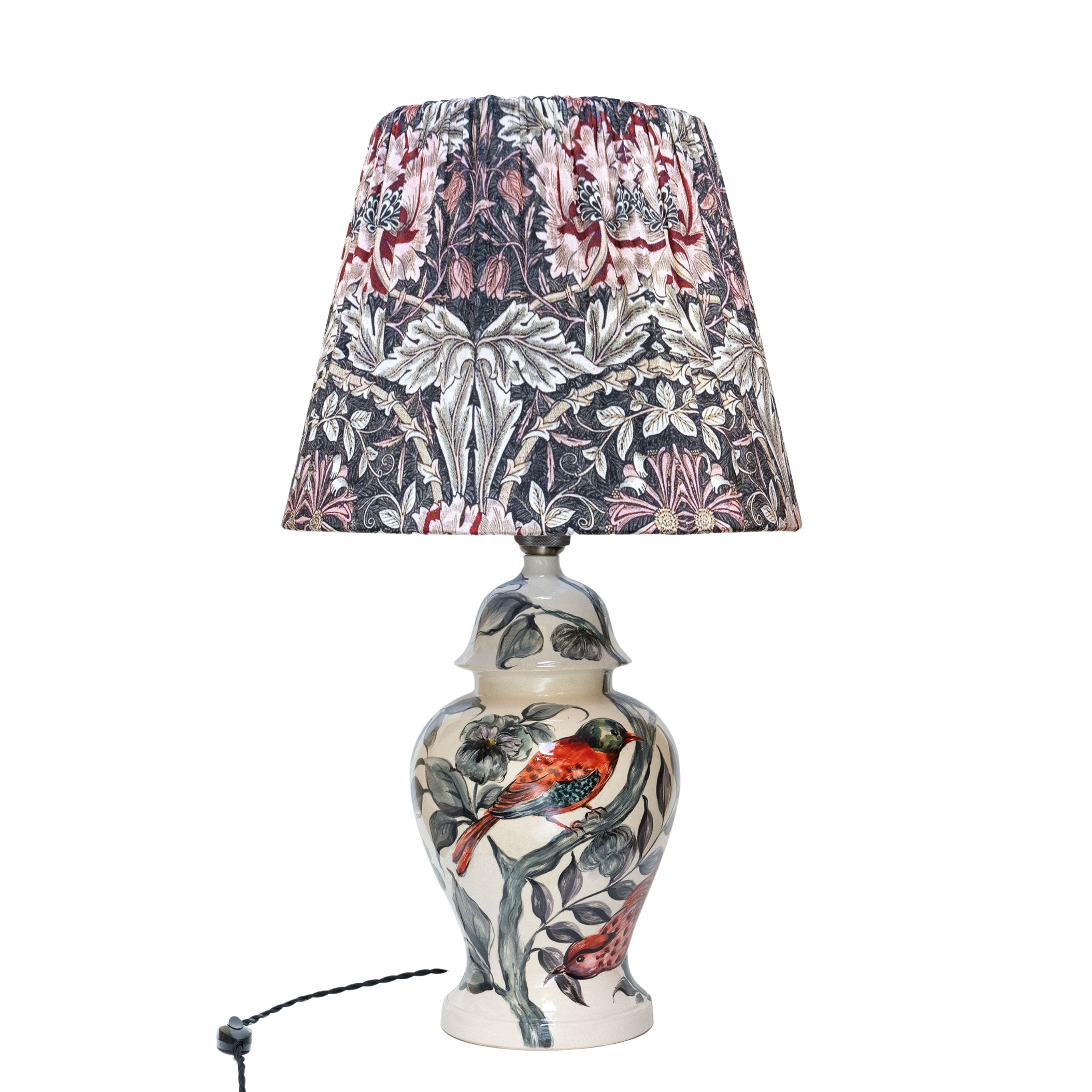 - Materials: Ceramic base, fabric lampshade