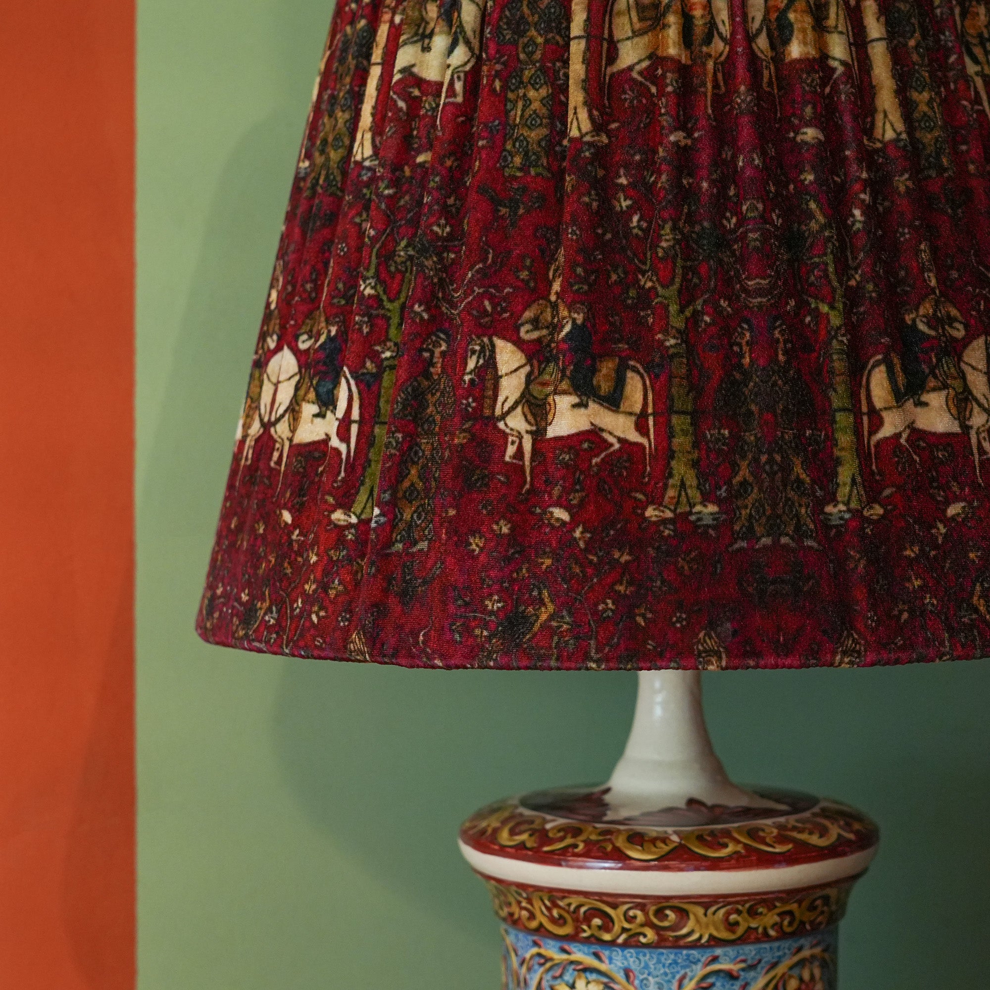 Red Fabric Shade: The lampshade features beautiful, traditional horsemen patterns, adding character and history to your décor.